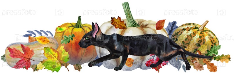 Черный кот с тыквой и осенними листьями