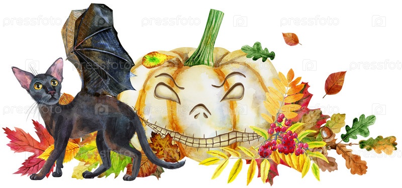 Акварельная иллюстрация милый черный кот с крыльями летучей мыши с тыквой на Хэллоуин