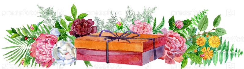 Акварельная иллюстрация с красной подарочной коробкой и пионами. Для дизайна, печати или фона