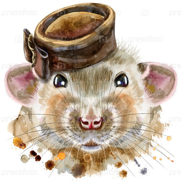 Симпатичная крыса в коричневой шляпе и для графики на футболках. Акварельная иллюстрация крысы