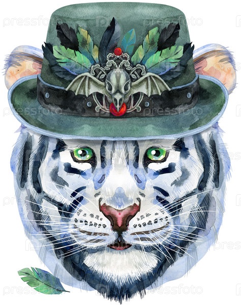 Акварельная иллюстрация белого тигра в шляпе на Хэллоуин с вороньим черепом и перьями. Акварельная иллюстрация диких животных на белом фоне