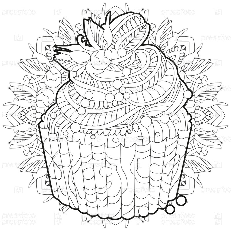 Векторный кусок торта на обрабатываемой круглой подложке.Ручной рисунок для окрашивания взрослых в стиле зентенгл, каракули.Окраски
