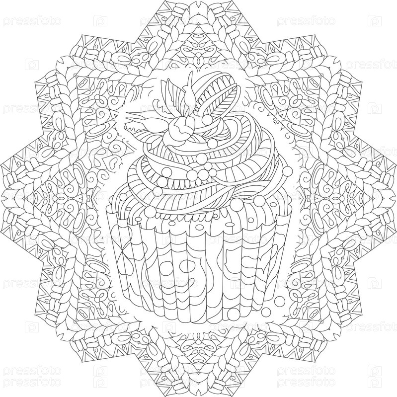 Векторный кусок торта на обрабатываемой круглой подложке.Ручной рисунок для окрашивания взрослых в стиле зентенгл, каракули.Окраски