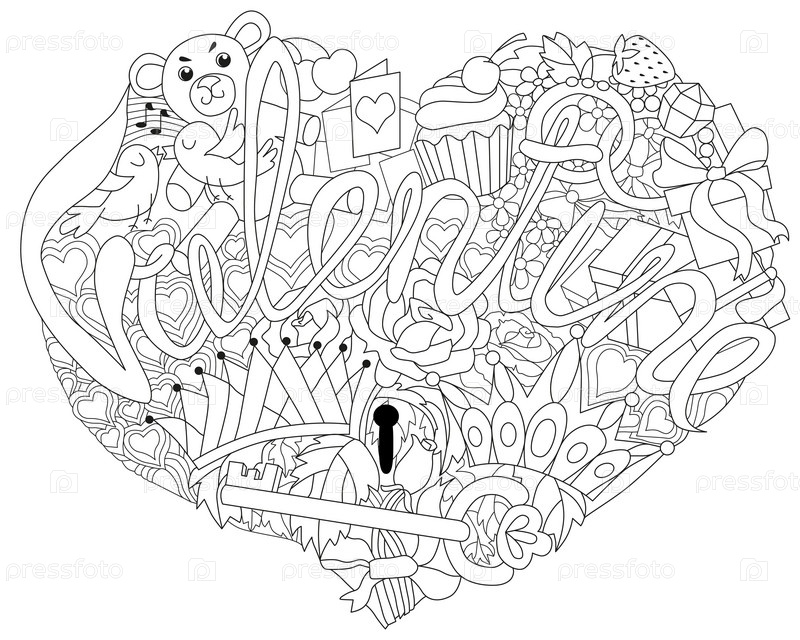 Текстуры векторной краски для взрослых со словом VALENTINE. Художественный дизайн рукописного росписи. Антистрессная краска для взрослых. Черно-белая ручная иллюстрация сердца для покраски