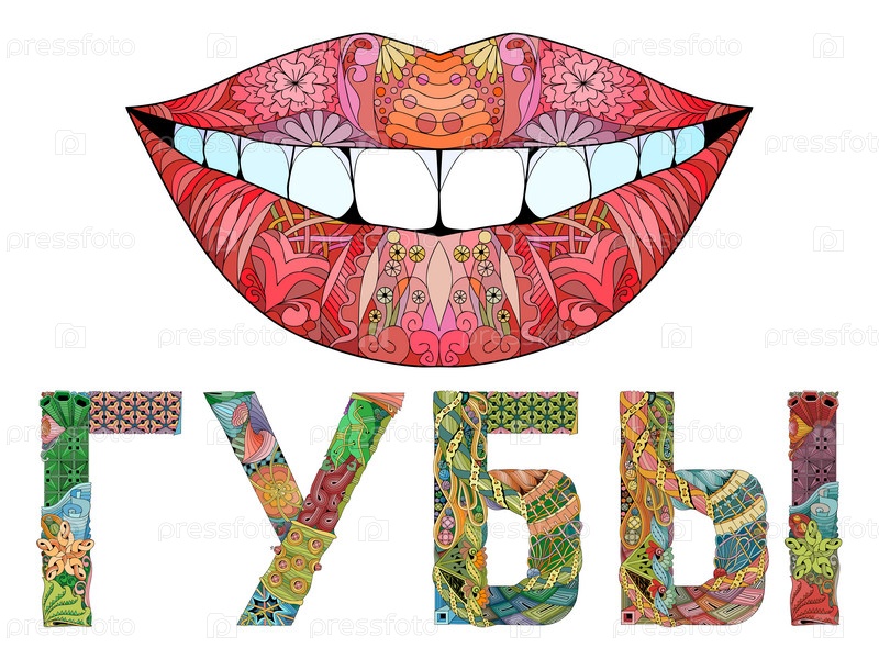Слово LIPS на русском языке с силуэтом губ. векторный декоративный объект zentangle