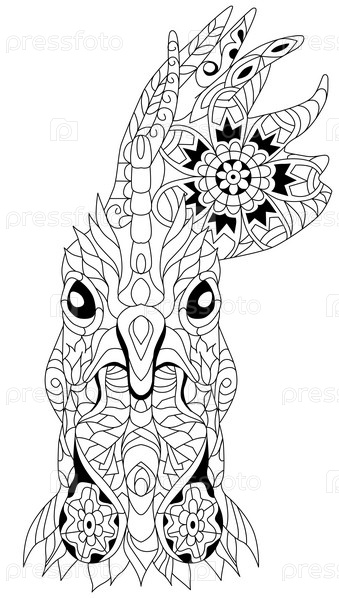 Запутанная голова петуха. Ручная рисованная декоративная векторная иллюстрация для окраски
