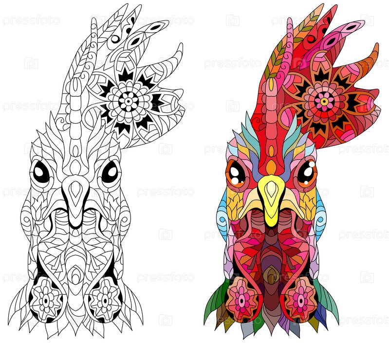 Запутанная голова петуха. Ручная рисованная декоративная векторная иллюстрация для окраски. Набор цветов и контуров