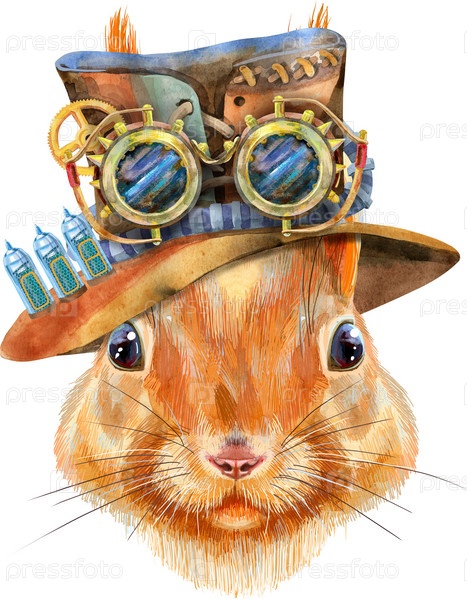 Акварельная ручная иллюстрация белки в стимпанк-шапке с гуглом