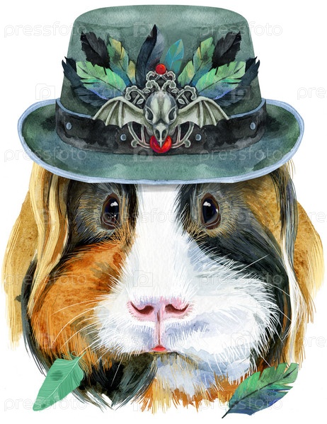 Акварельный портрет абиссинской морской свинки в оливковой шляпе с вороньим черепом и перьями на белом фоне