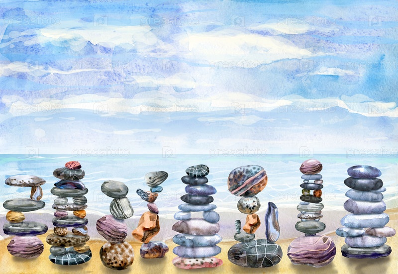 Акварельные морские стеки из плоских камешков для дизайна обоев. Красочные обои. Фоновая иллюстрация