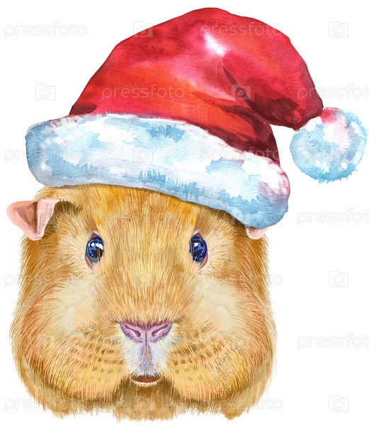Милая морская свинка. Свинья для графики на футболках. Акварель английская морская свинка с иллюстрацией в шляпе Санты