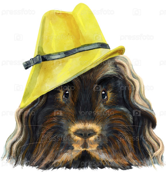 Симпатичная морская свинка в желтой шляпе. Свинья для графики на футболках. Акварель мериносовая морская свинка
