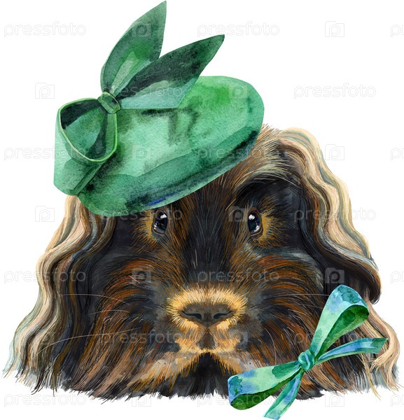 Акварельный портрет морской свинки мериноса в зеленой шляпе на белом фоне