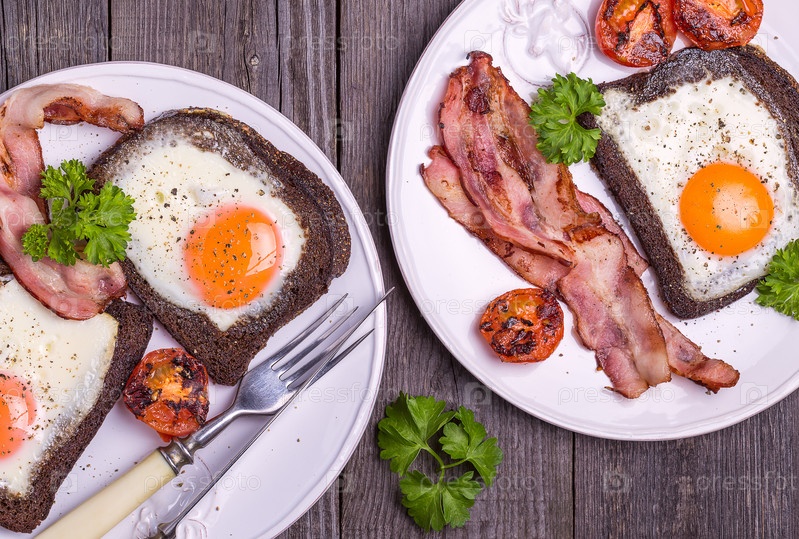 Яичница в ржаном хлебе с беконом, помидорами и петрушкой по-деревенски