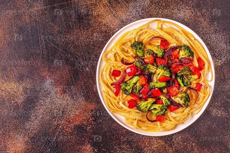 Паста с брокколи, перцем, луком