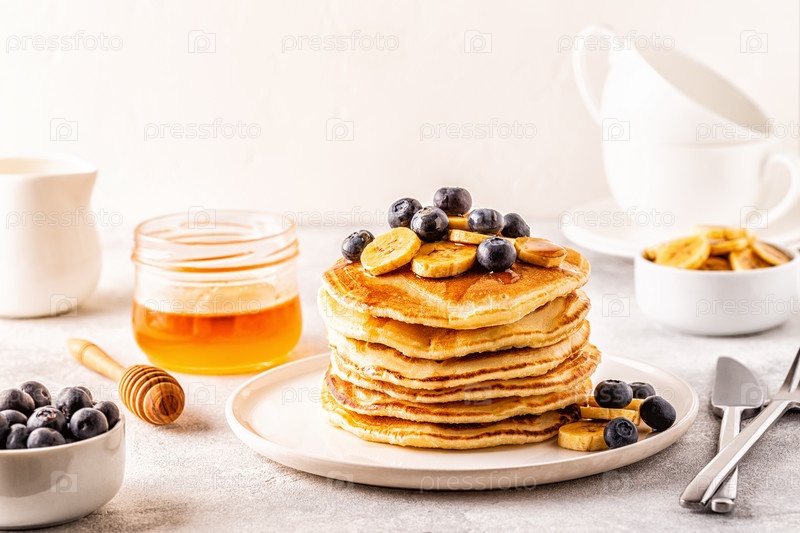 Блинчики с бананом, черникой на белой тарелке