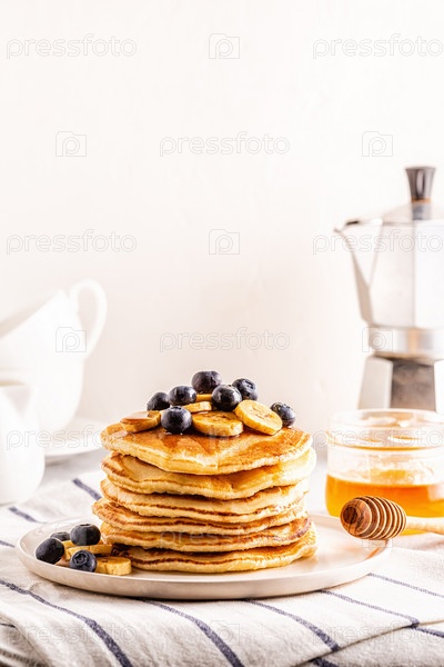 Блинчики с бананом, черникой на белой тарелке