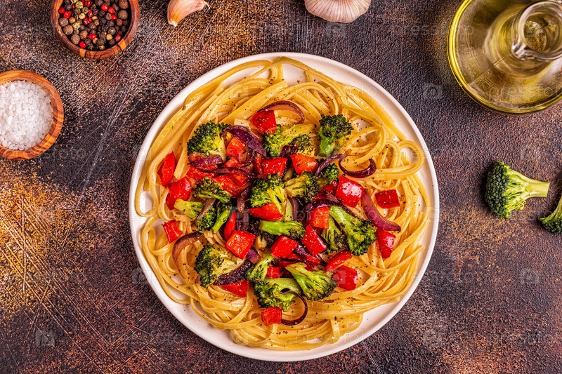 Паста с брокколи, перцем, луком