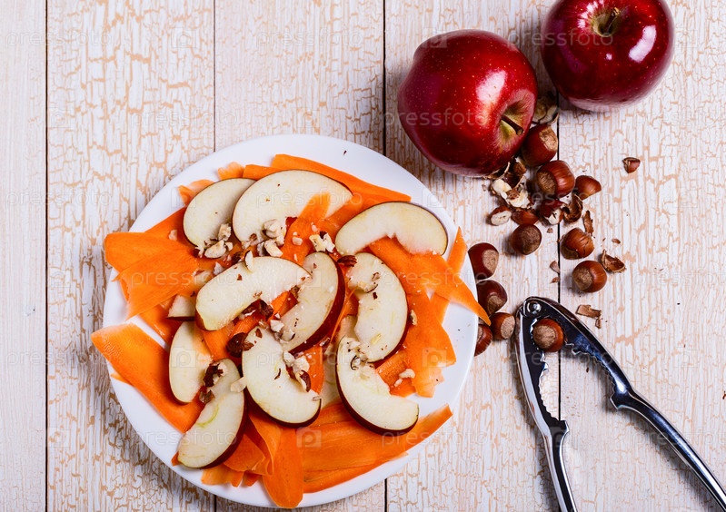 Свежий салат с яблоками, морковью, фундуком