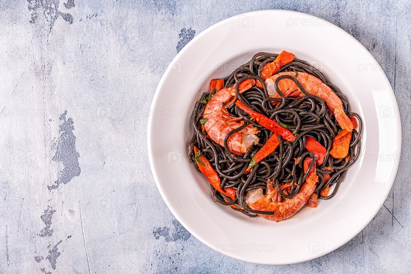 Черные спагетти с креветками и овощами