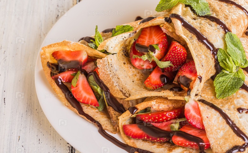 Домашние блины с клубникой и шоколадным сиропом