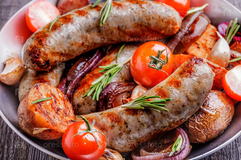 Жареные колбаски и овощи в деревенском стиле