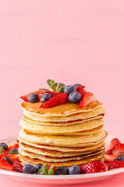 Блины с ягодами на ярком пастельном фоне