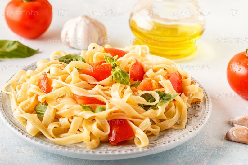 Паста с томатным соусом, подается с базиликом