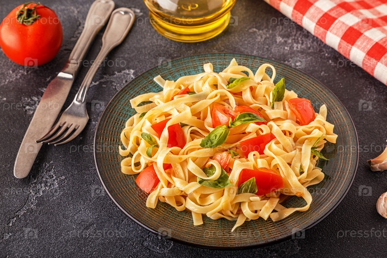 Паста с томатным соусом, подается с базиликом