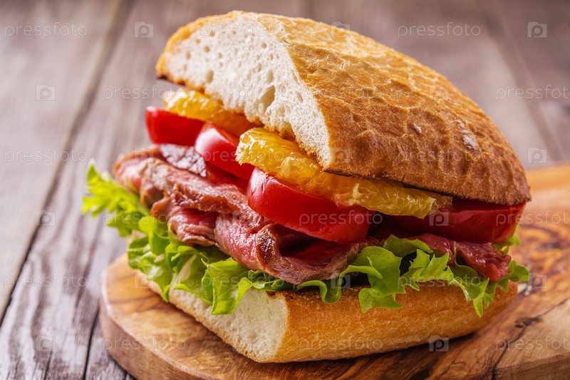 Сочный стейк-сэндвич с овощами и кусочками апельсина