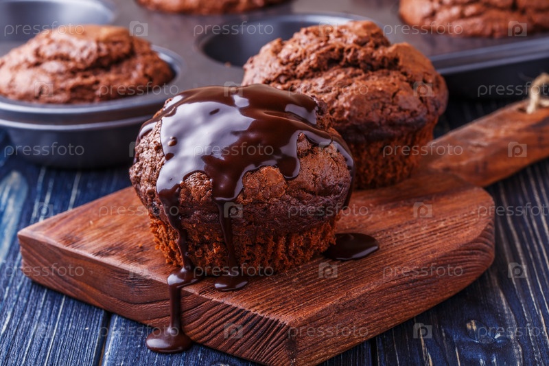 Шоколадные кексы с шоколадным сиропом на темном фоне
