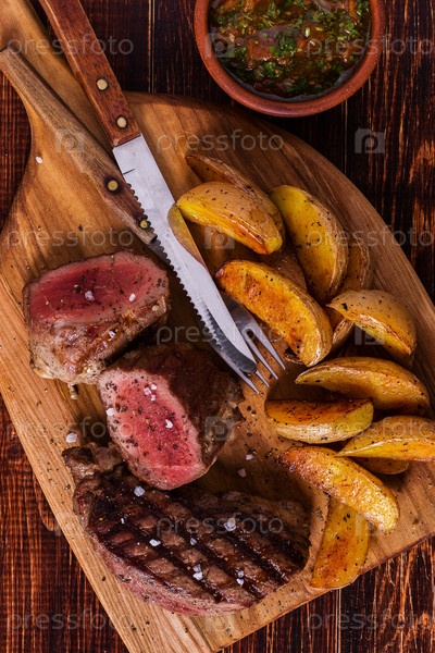Стейк на гриле с картофельными дольками, сальсой и специями