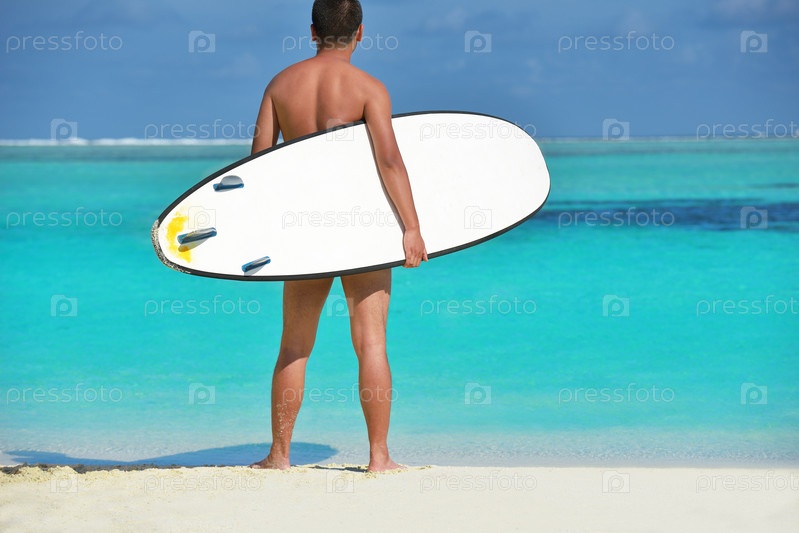Мужчина с доской для серфинга на пляже