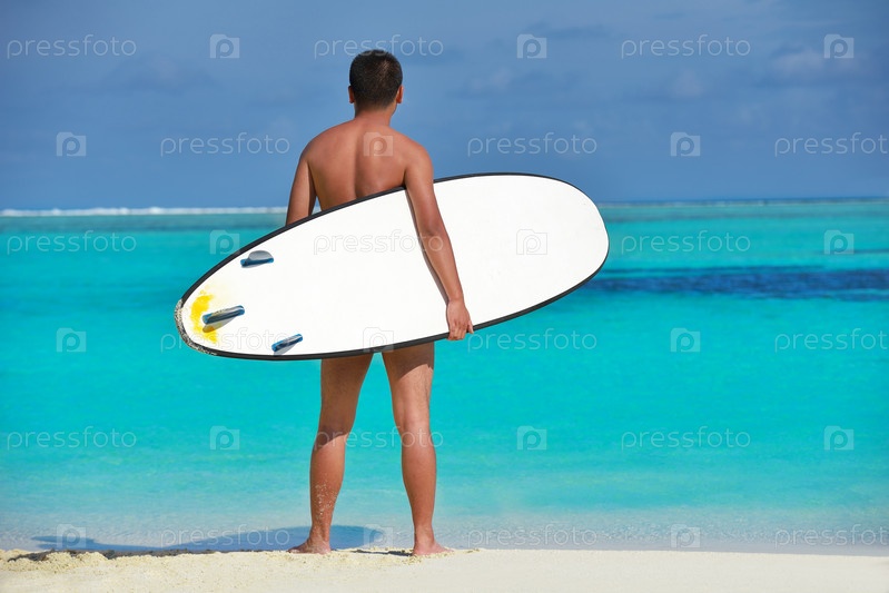 Мужчина с доской для серфинга на пляже