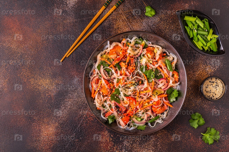Азиатский салат с рисовой лапшой, креветками и овощами