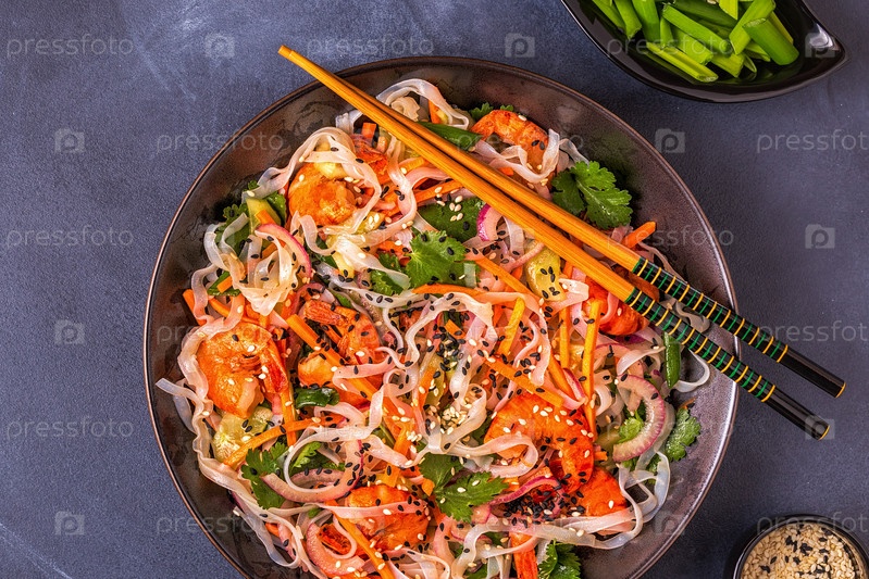 Азиатский салат с рисовой лапшой, креветками и овощами