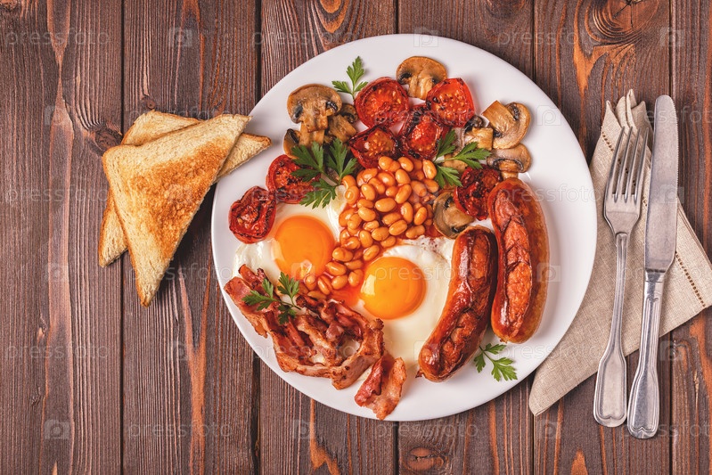 Традиционный полный английский завтрак с яичницей, сосисками, фасолью, грибами, помидорами на гриле и беконом на деревянном фоне