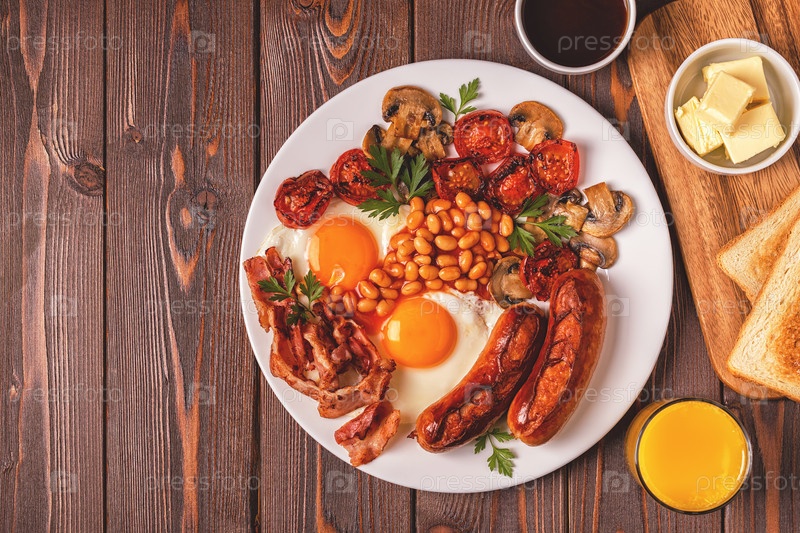 Традиционный полный английский завтрак с яичницей, сосисками, фасолью, грибами, помидорами на гриле и беконом на деревянном фоне