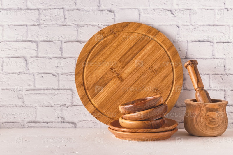 Деревянная посуда на белом столе