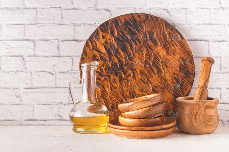 Деревянная посуда на белом столе