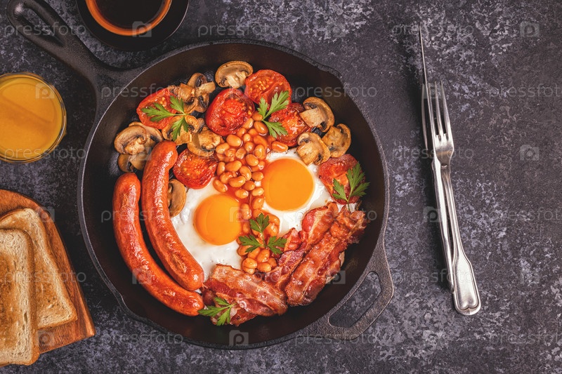 Традиционный полный английский завтрак с яичницей, сосисками, фасолью, грибами, помидорами на гриле и беконом