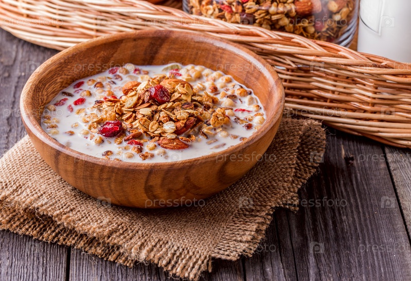 Домашняя гранола с молоком, ягодами, семечками и орехами