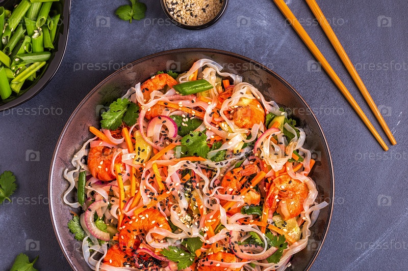 Азиатский салат с рисовой лапшой, креветками и овощами
