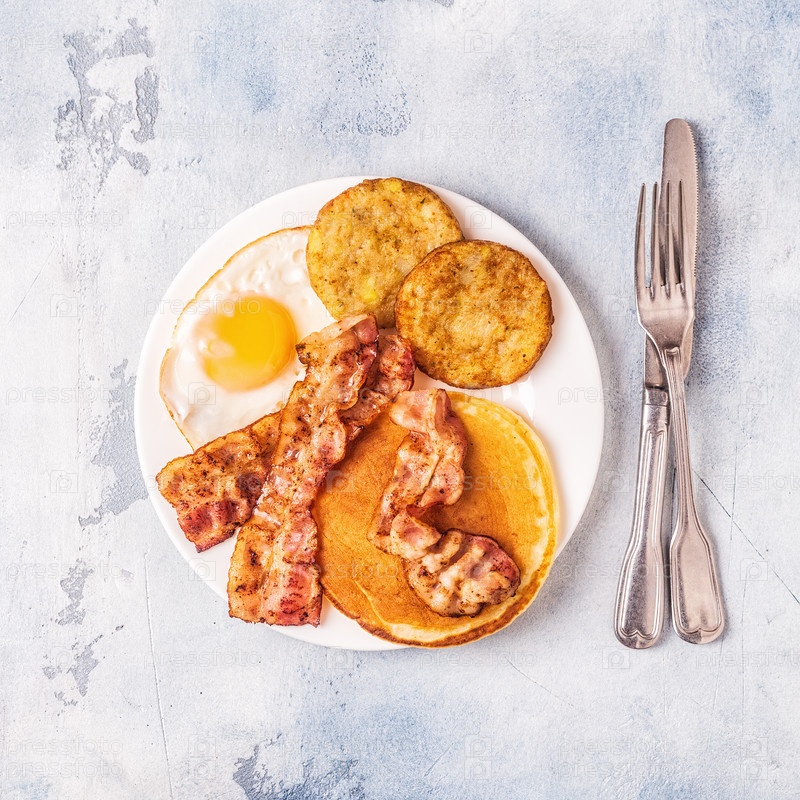 Здоровый полный американский завтрак с яйцами, блинчиками с беконом и латкесом