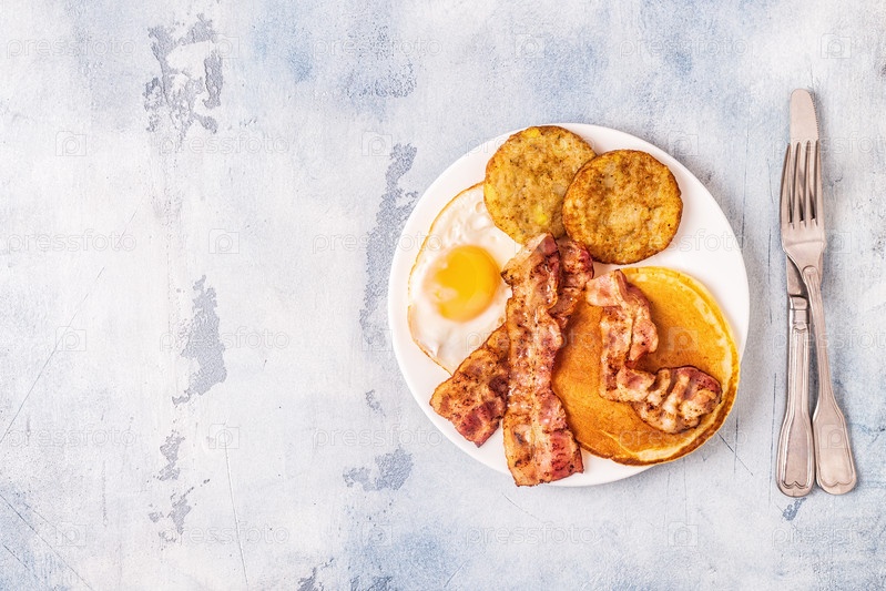 Здоровый полный американский завтрак с яйцами, блинчиками с беконом и латкесом