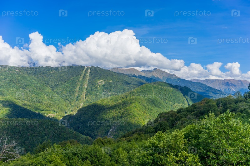 Горный пейзаж против облачного голубого неба в Красной Поляне Сочи