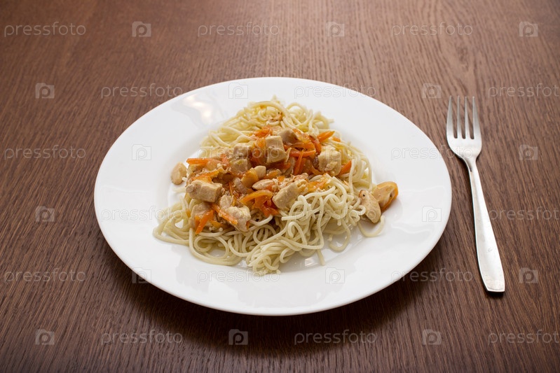 Спагетти с мясом и овощами на белой тарелке на деревянном столе. закрытый крупным планом