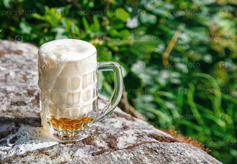 Стеклянная кружка с пивом или квасом стоит на большом камне