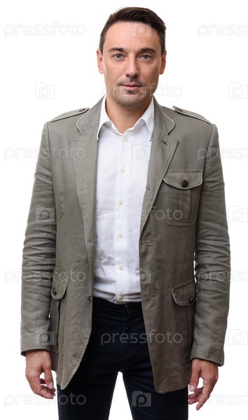 Улыбающийся красивый мужчина в куртке. Изолированный
