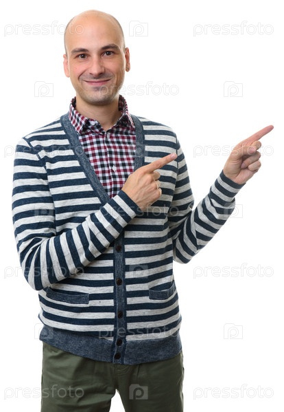 Счастливый человек, указывая пальцами, чтобы скопировать пространство. Изолированный